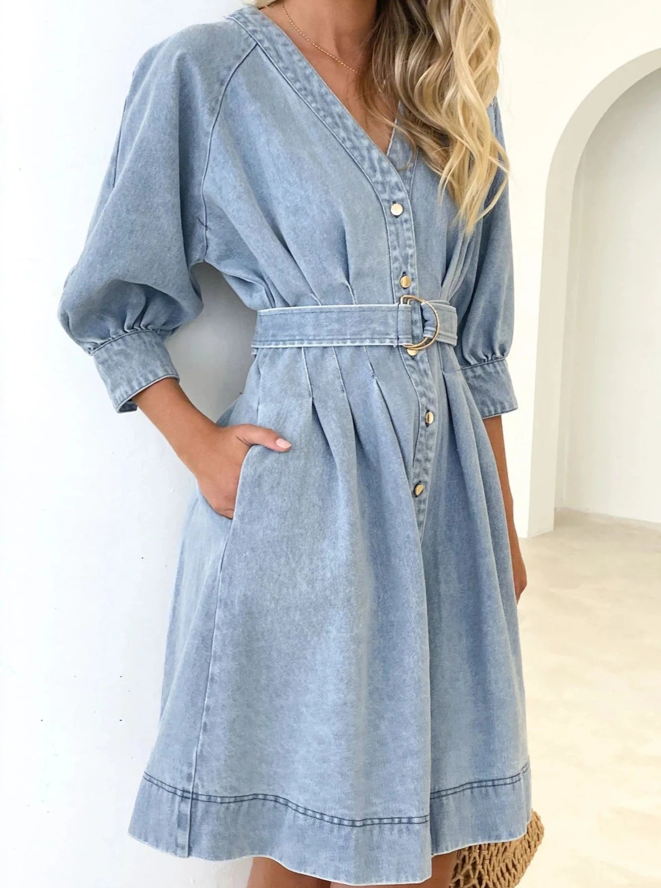 Featuring a feminine touch, the Ibiza Denim Dress boasts a V neckline, non-stretch buff sleeves, multiple buttons, a belt, and convenient side slit pockets.