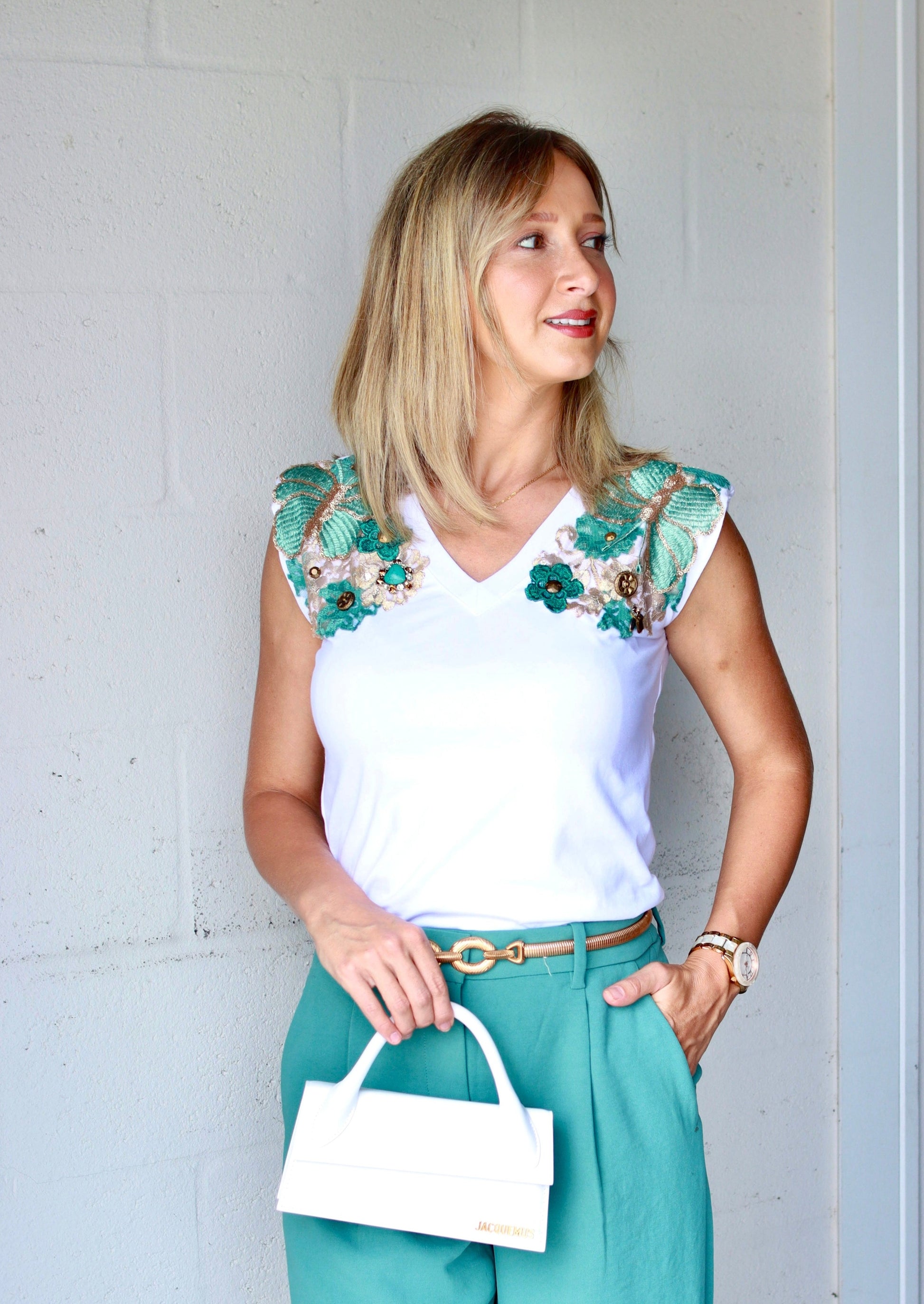 The Lilly Embroidered Top shows a delicate and floral motif with enchanting blossoms. The V neckline provides a hint of sophistication, while the floral print fabric radiates an elegant charm.