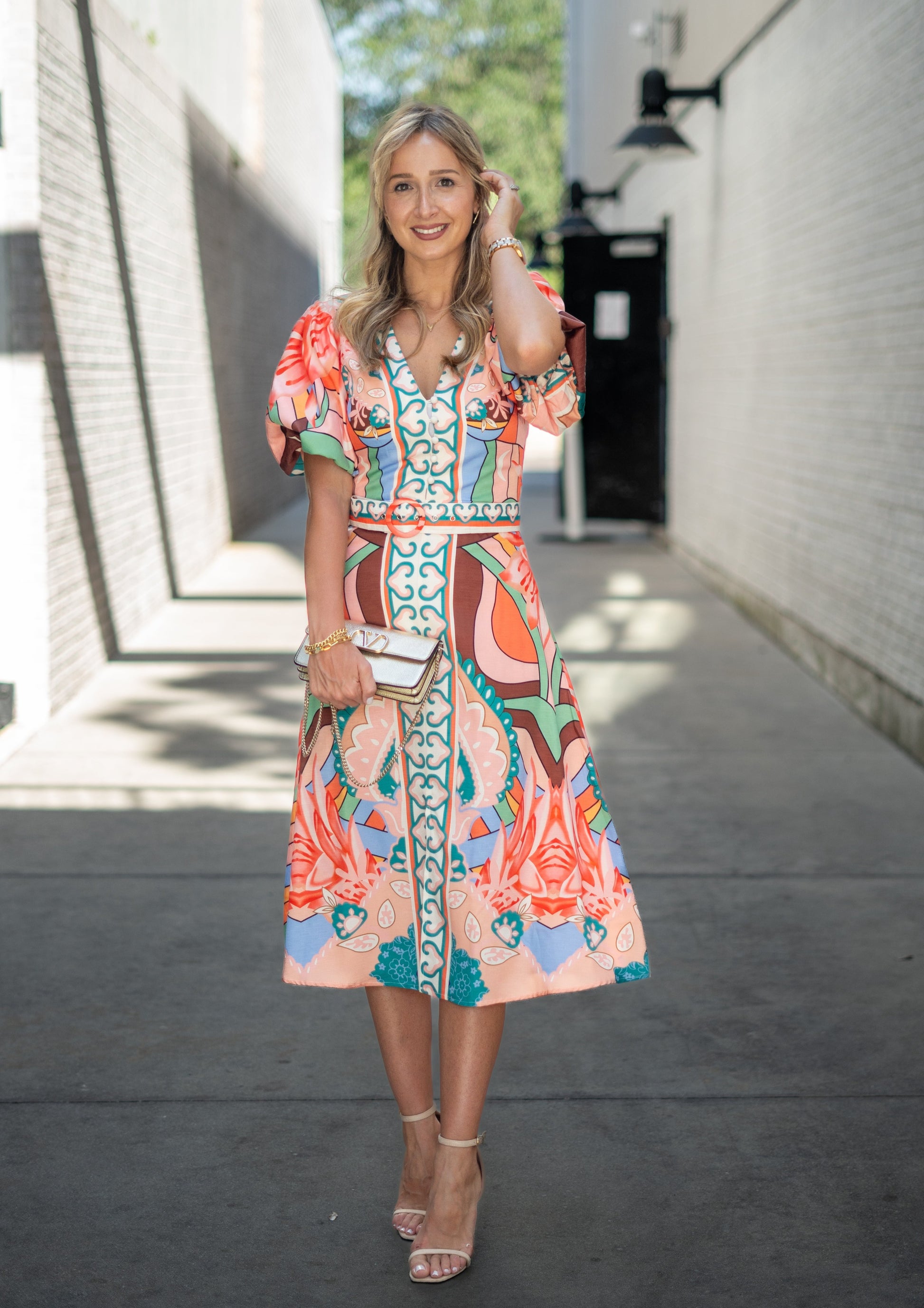 The Lisbon Dress features a V neckline with buttons, short flowy sleeves, and a fitted bodice for a chic and comfortable look. It also comes with a belt and a side zipper for added convenience. It offers a loose fit and is non-stretch for a breathable and elegant feel.