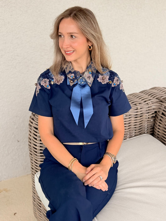 Cold shoulder flower embellished ribbed sweater- Navy Ble