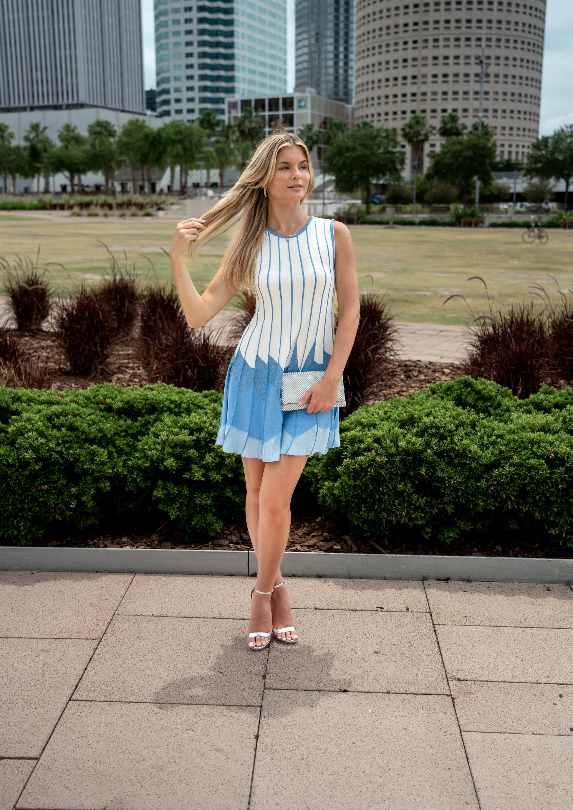 Feminine styling with the Dubai Dress! For all events from day to night, the Blue Pleated Mini Knitwear Dress will be the perfect choice for women who want to have a romantic and stylish look.