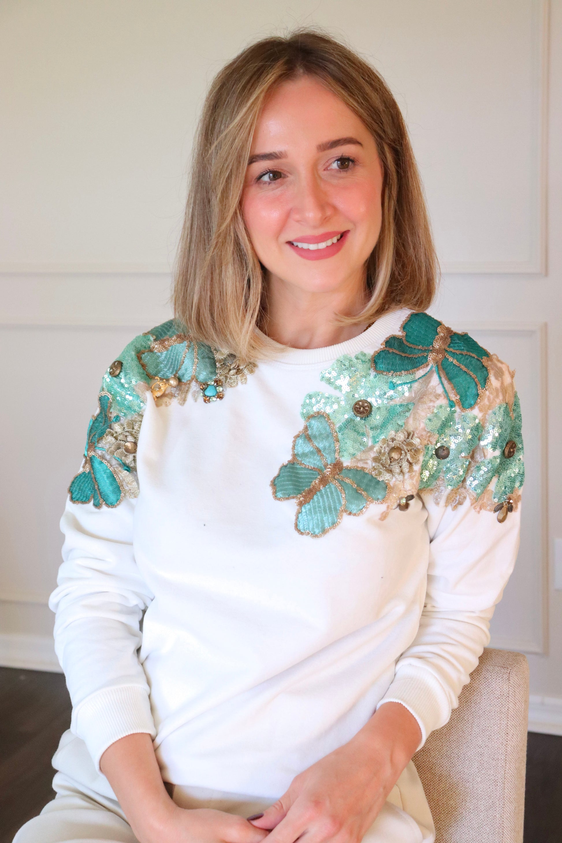 This embroidered top features a delicate floral motif with enchanting blossoms, enhanced with subtle sequin details for a touch of refined sparkle. The classic crew neck and long sleeves create a balanced, elegant silhouette, while the floral fabric radiates timeless charm. Crafted from soft cotton, it’s perfect for elevating both daytime and evening looks.