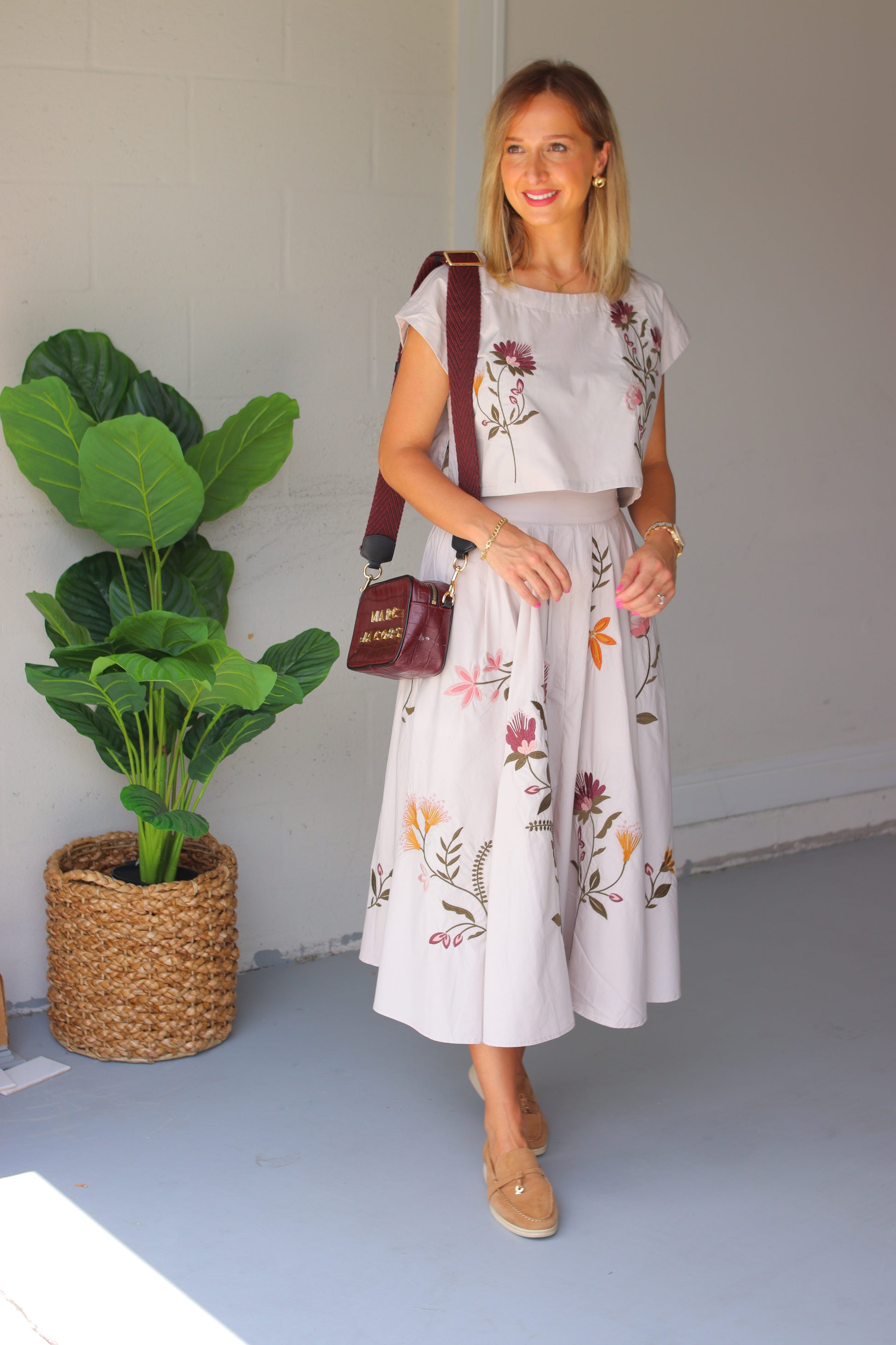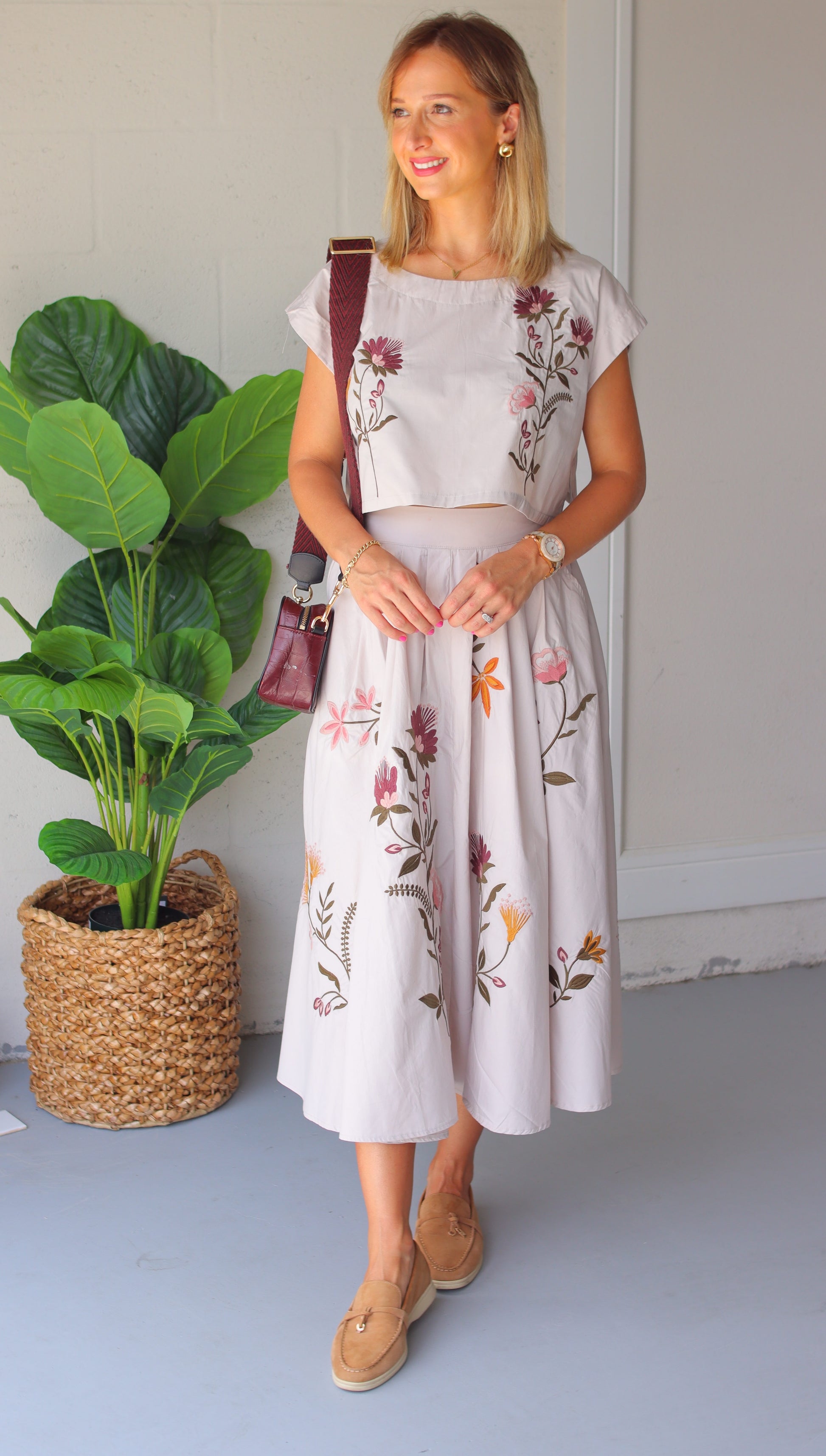 This stunning set features floral embroidery, a round neckline, side slits, short cap sleeves, and cropped length. The relaxed fit crop top pairs perfectly with the high rise elastic back waist midi skirt, complete with side pockets. Must-have for any season. Perfect for transitioning from summer to holiday.