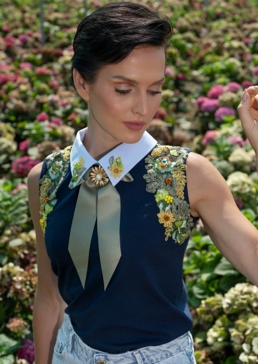 Cuello polo bordado a mano Top femenino elegante y sin esfuerzo que presenta encantadores diseños florales; se completa con un cuello polo.