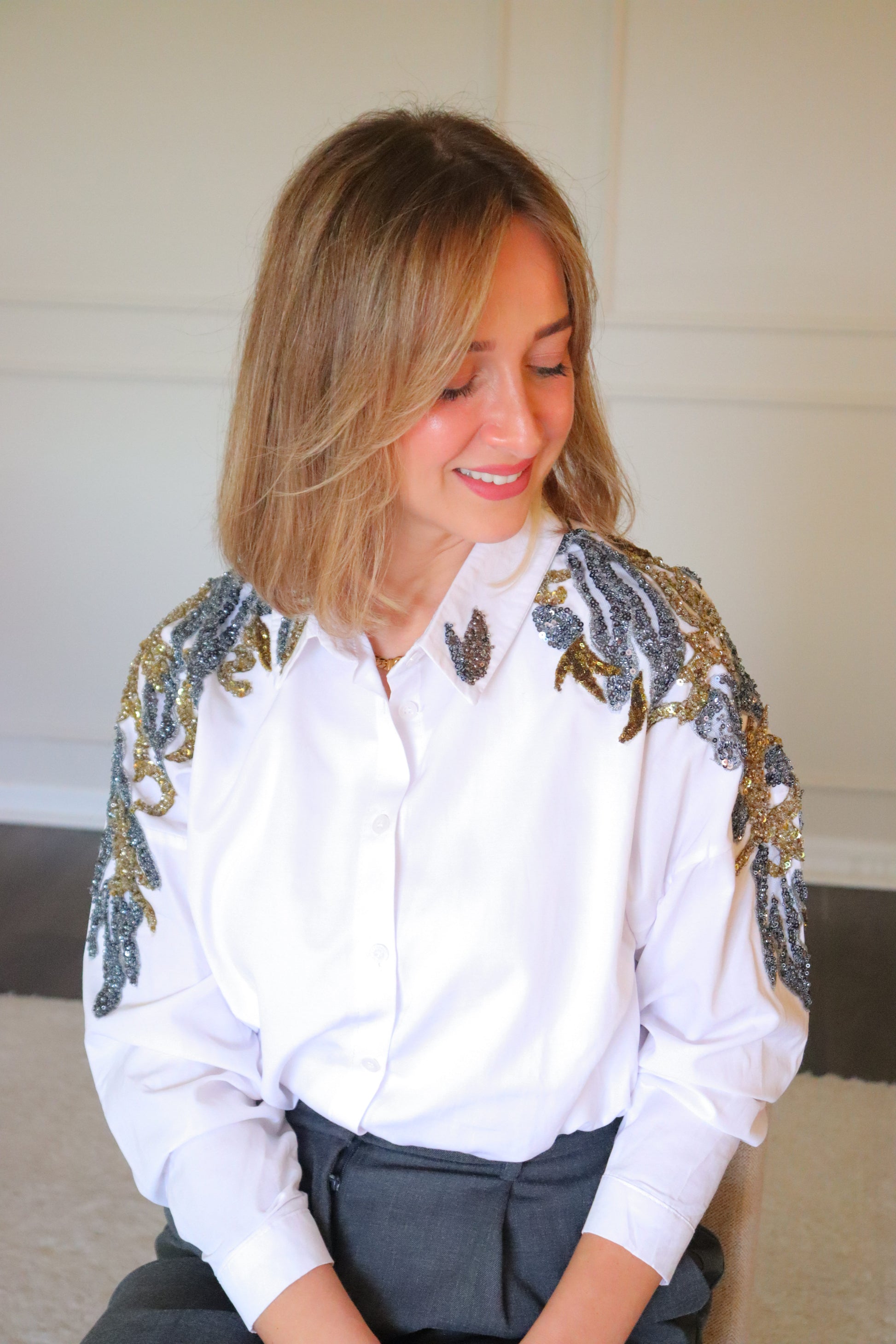 This loose-fitting classic shirt redefines everyday style with statement cutout shoulder details and delicate beading that frames the shoulder and cascades down one sleeve. Designed to fit like a traditional shirt—but made fancy—this dressy take on casual is perfect for holiday gatherings and elevated off-duty looks.