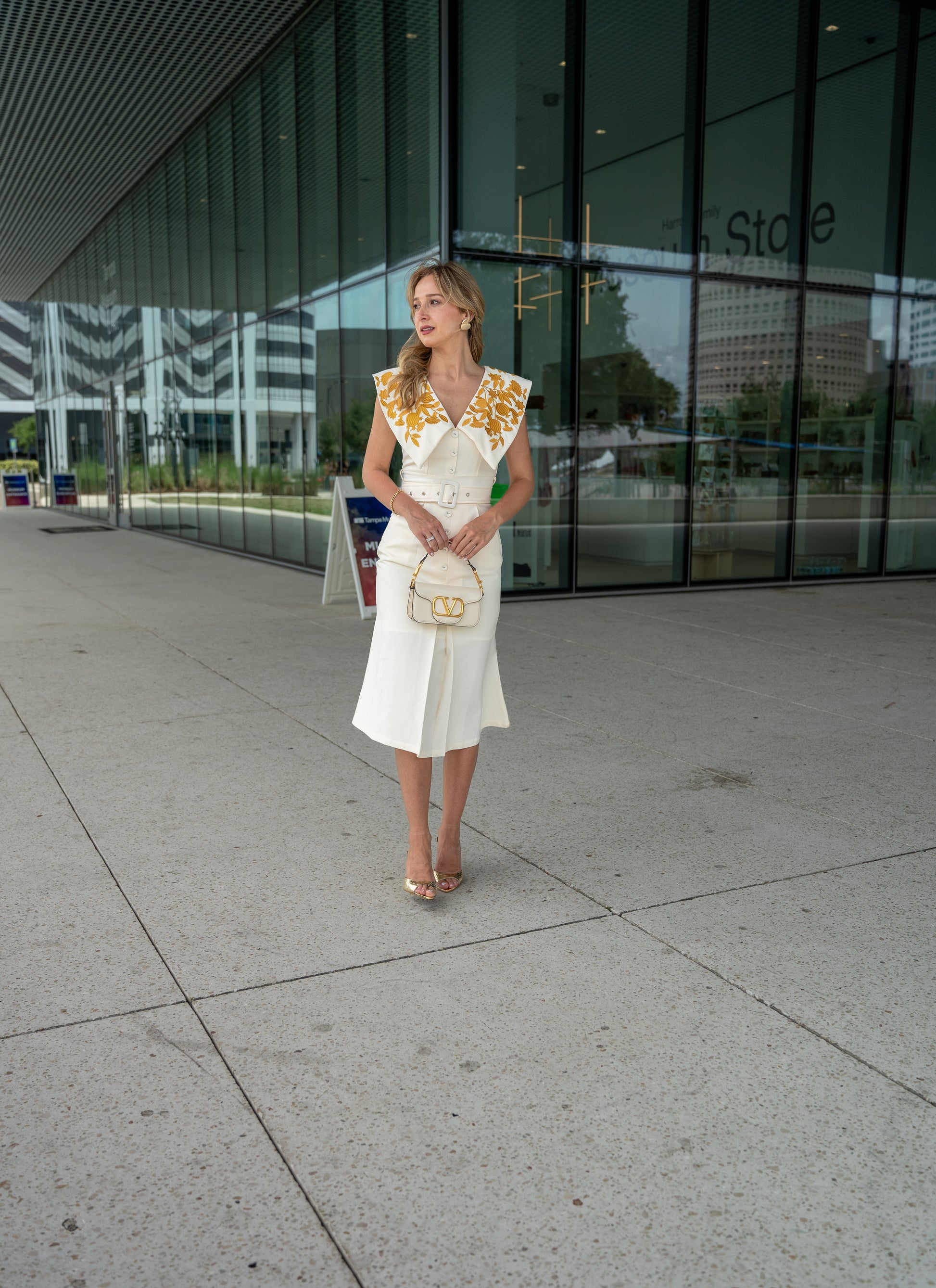 The dress features a beautifully embroidered floral pattern that weaves intricate, vibrant designs across the fabric, adding a touch of nature-inspired artistry. stunning sleeveless long dress, V neck perfect for a range of occasions from summer soirées to elegant evening gatherings.